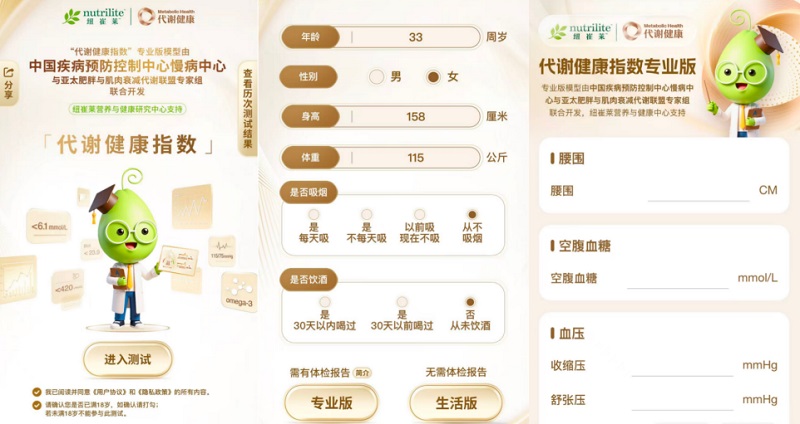 為進(jìn)一步推動(dòng)慢性病防治關(guān)口前移,順應(yīng)公眾主動(dòng)健康需求,安利紐崔萊營養(yǎng)與健康中心支持中疾控慢病中心與亞太肥胖與肌肉衰減代謝聯(lián)盟,開發(fā)并推出“代謝健康指數(shù)”,借助數(shù)字化技術(shù),對(duì)個(gè)人代謝水平進(jìn)行動(dòng)態(tài)量化科學(xué)評(píng)估,并匹配個(gè)性化干預(yù)方案,為使用者合理膳食及踐行健康生活方式提供依據(jù)。