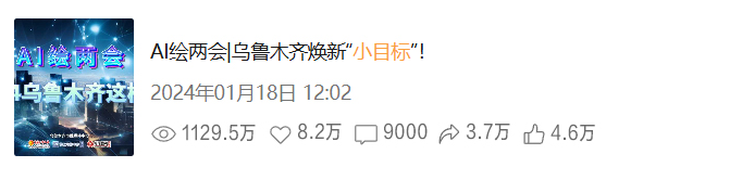 及時(shí)報(bào)道全國(guó)兩會(huì)、自治區(qū)兩會(huì)、市兩會(huì)等重大會(huì)議,渲染氣氛、營(yíng)造氛圍。堅(jiān)持移動(dòng)優(yōu)先,全媒體發(fā)力,突出新技術(shù)、協(xié)作化,元宇宙、AI繪畫、彈幕海報(bào)、全景視頻等融媒產(chǎn)品覆蓋報(bào)紙、網(wǎng)站、客戶端、微博、抖音等平臺(tái),形成全媒體、全終端、全覆蓋傳播效應(yīng)。其中,微博話題#聚焦2024烏魯木齊市兩會(huì)#閱讀量501.7萬次。