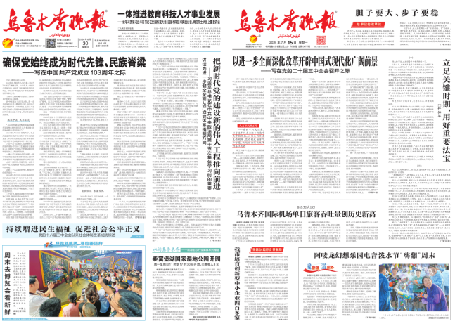 烏魯木齊晚報(bào)“央媒看新疆”專欄(2024年7月11日)、“黨紀(jì)學(xué)習(xí)教育”專欄(2024年6月27日)、理論/評(píng)論版面“深入學(xué)習(xí)貫徹習(xí)近平新時(shí)代中國(guó)特色社會(huì)主義思想”專欄(2024年7月18日)