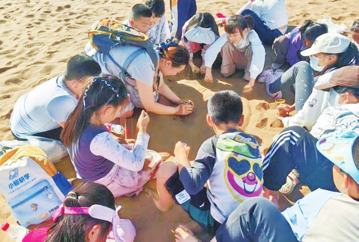 在新疆網(wǎng)傳媒科技有限公司開展的研學活動中,孩子們在導師引導下利用沙堆做小實驗。(受訪者供圖)