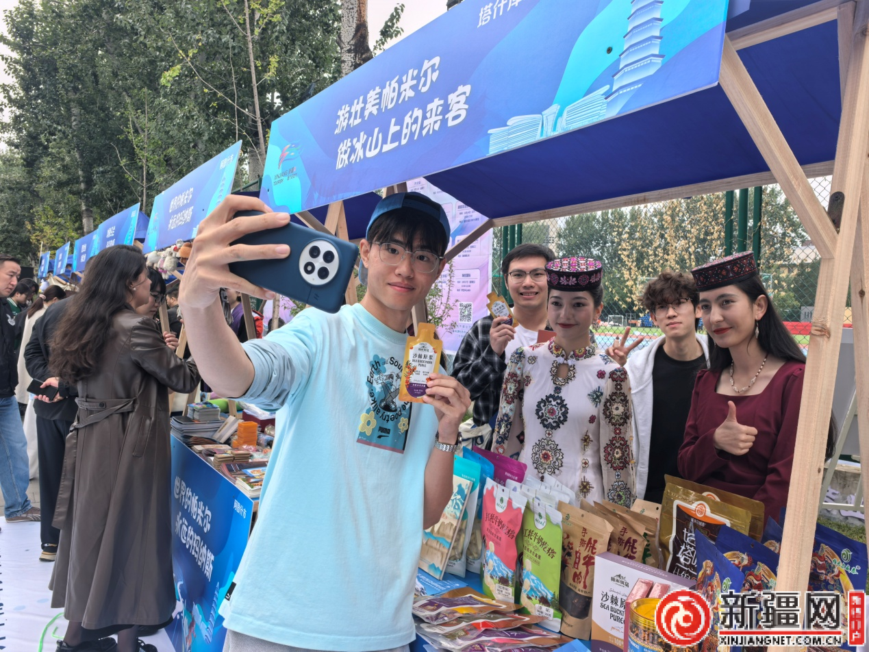 新疆文旅市集現(xiàn)場熱鬧非凡。一名大學(xué)生與文創(chuàng)展區(qū)工作人員合影留念。(薛玲攝)