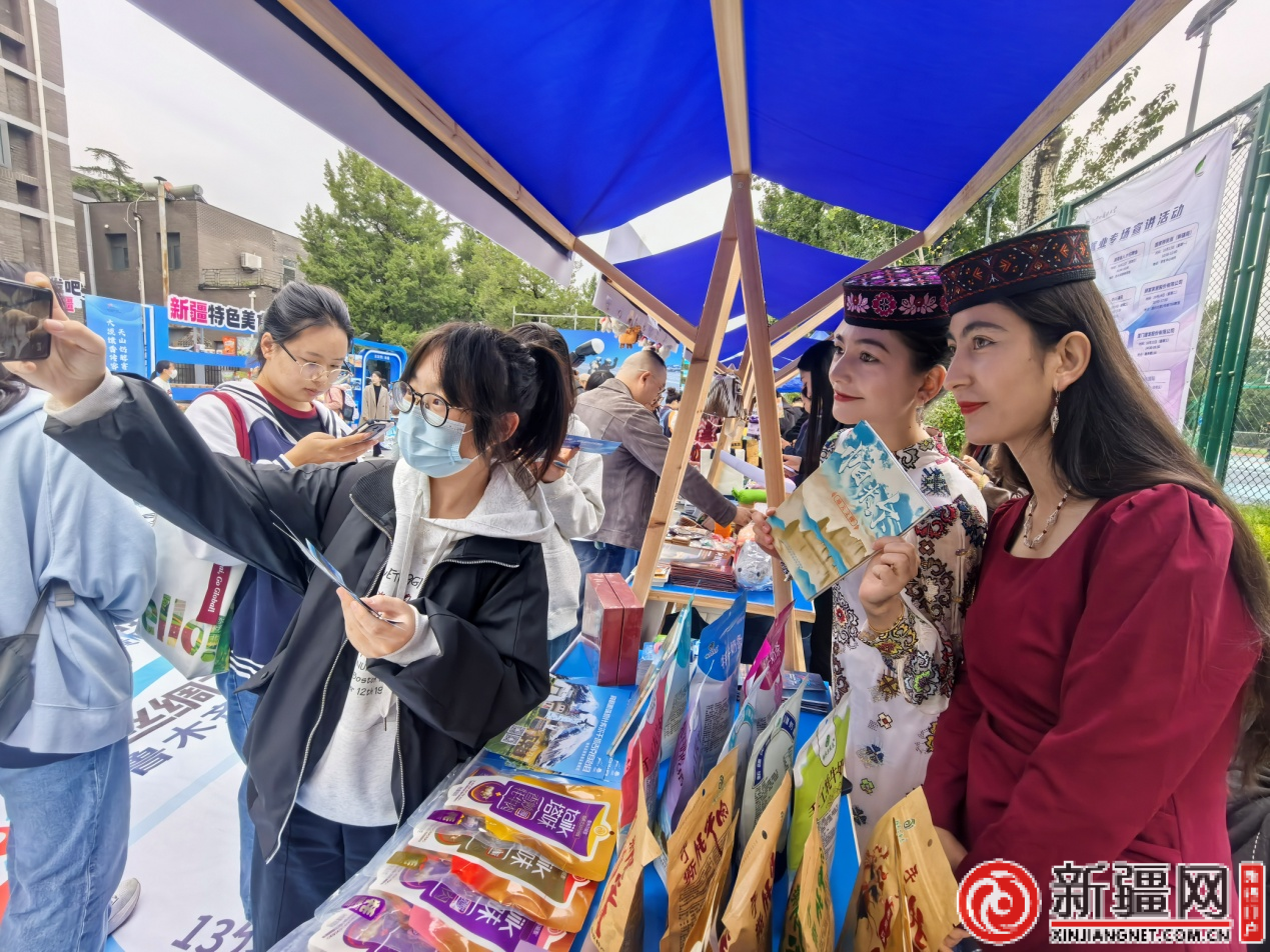 在文旅市集,新疆特色美食展區(qū)吸引眾多學(xué)生前來打卡。(薛玲攝)