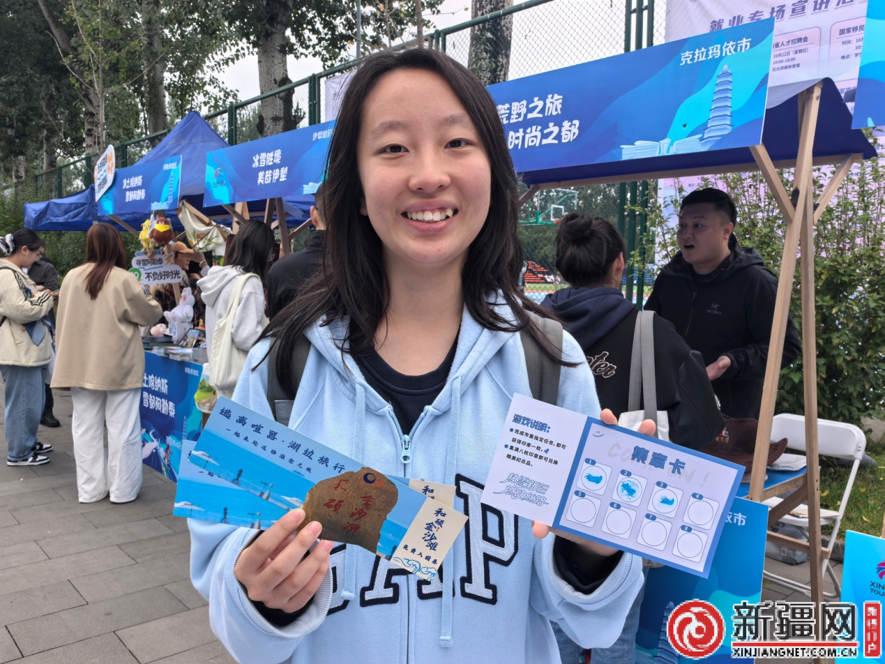 在新疆文旅市集,一名大學(xué)生高興地領(lǐng)到了免費景區(qū)門票。(薛玲攝)