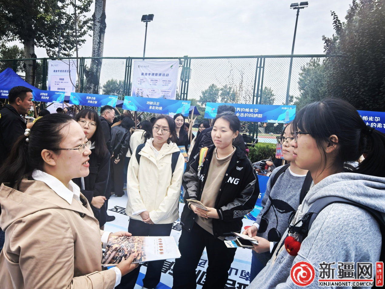 在新疆文旅市集現(xiàn)場,新疆網(wǎng)商務(wù)總監(jiān)、新疆網(wǎng)研學(xué)項目負(fù)責(zé)人梁丹丹給學(xué)生們介紹新疆優(yōu)質(zhì)研學(xué)資源,并誠邀大學(xué)生們到新疆研學(xué)。(薛玲攝)
