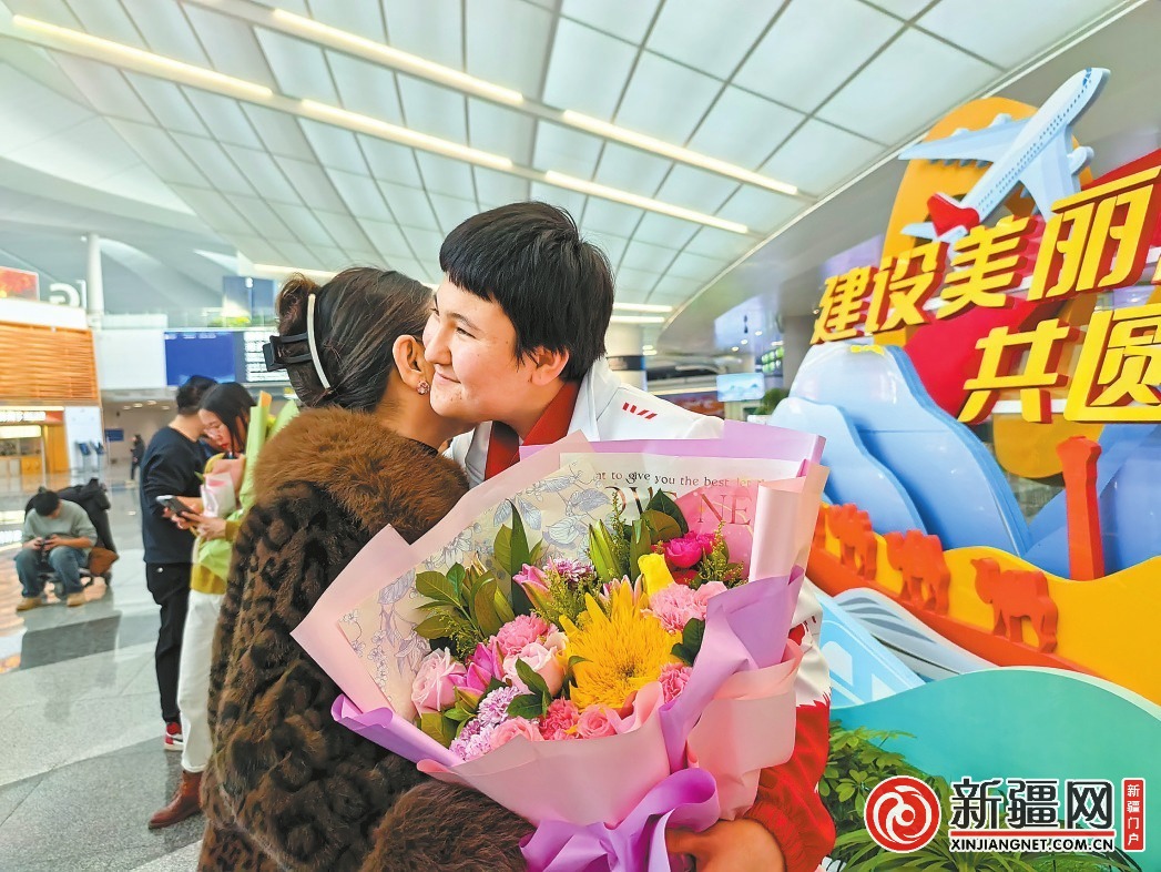 12月16日,在烏魯木齊天山國(guó)際機(jī)場(chǎng),運(yùn)動(dòng)員馬甫吐依娜·木旦里甫與母親如苦亞·沙吾提相擁慶祝。(記者王麗娜攝)