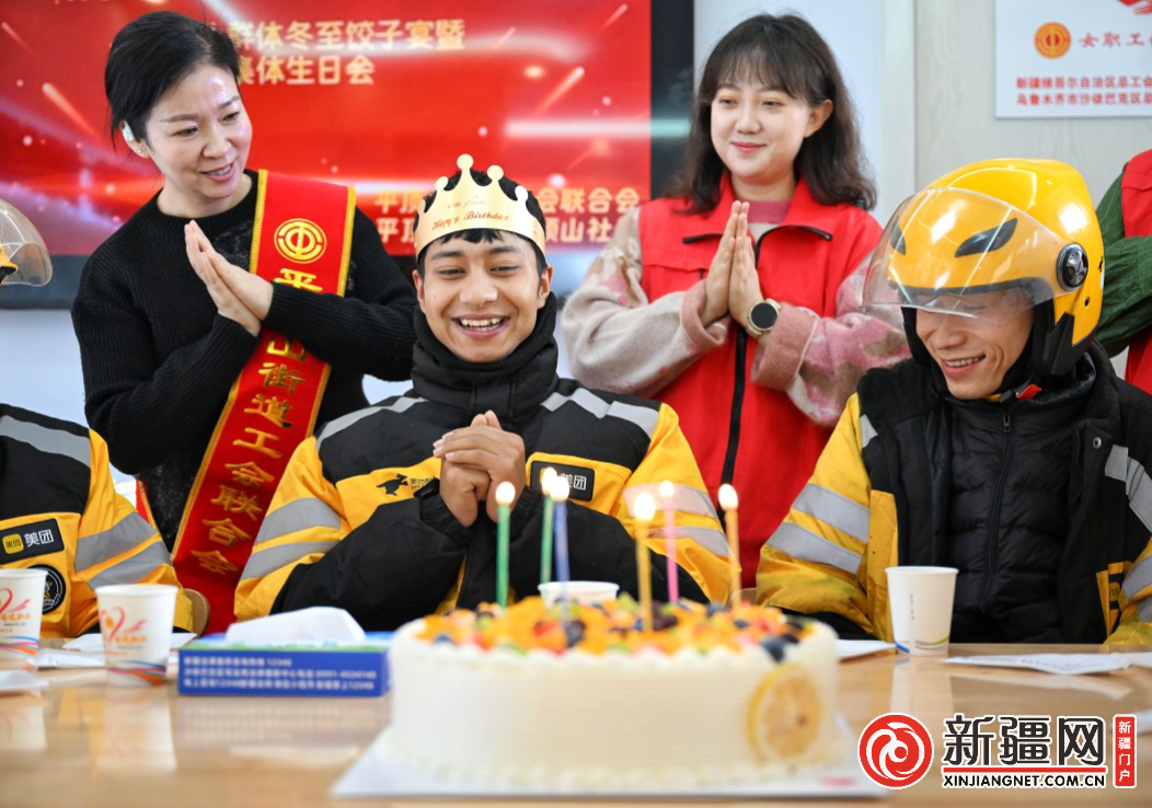 2025年12月19日,在沙依巴克區(qū)平頂山街道平頂山社區(qū)工會驛站,工作人員為12月份生日的騎手過生日。(烏魯木齊晚報(bào)資料圖片)