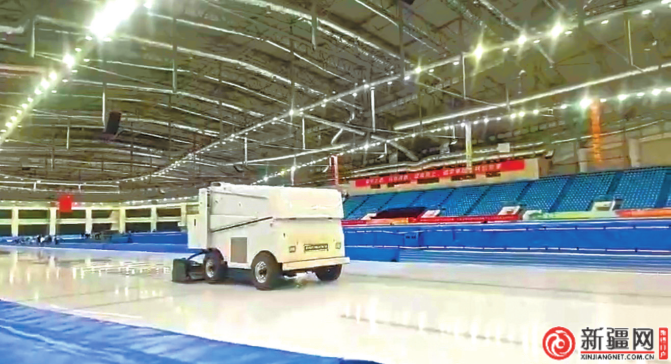 在新疆冬季運(yùn)動(dòng)訓(xùn)練中心速度滑冰場館,澆冰車在維護(hù)冰面。(記者陳彥仿攝)
