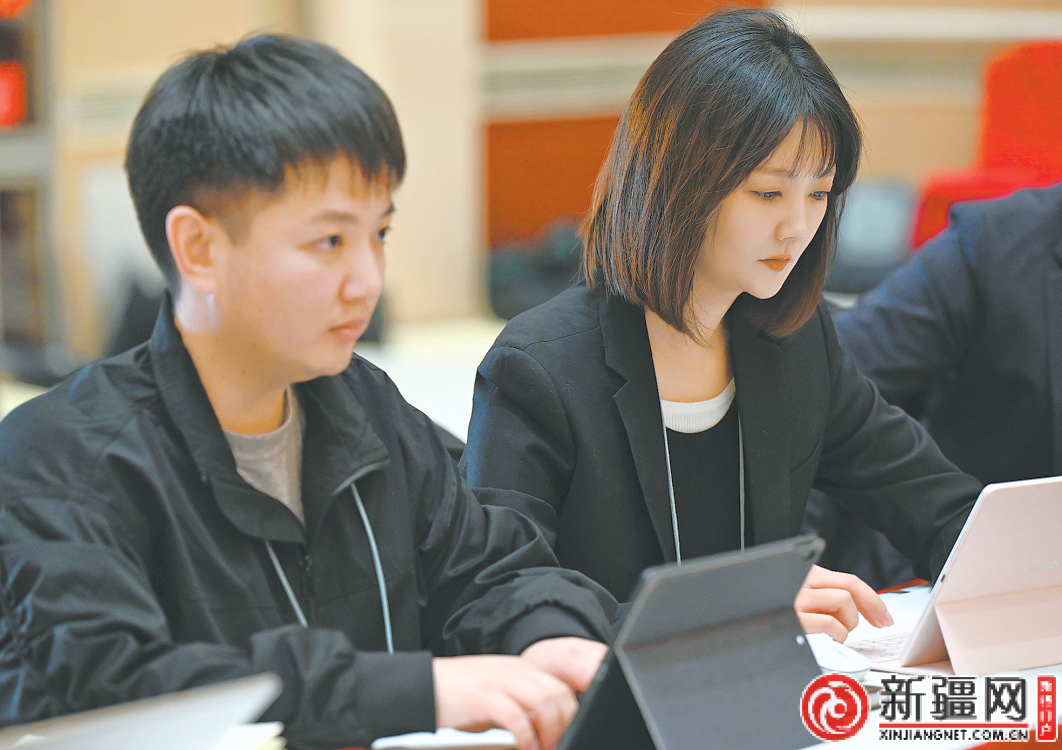 1月19日,在政協(xié)烏魯木齊市第十四屆委員會(huì)第五次會(huì)議間隙,烏魯木齊晚報(bào)全媒體記者肖翔(左)、賈夢(mèng)妍正在寫(xiě)稿。
