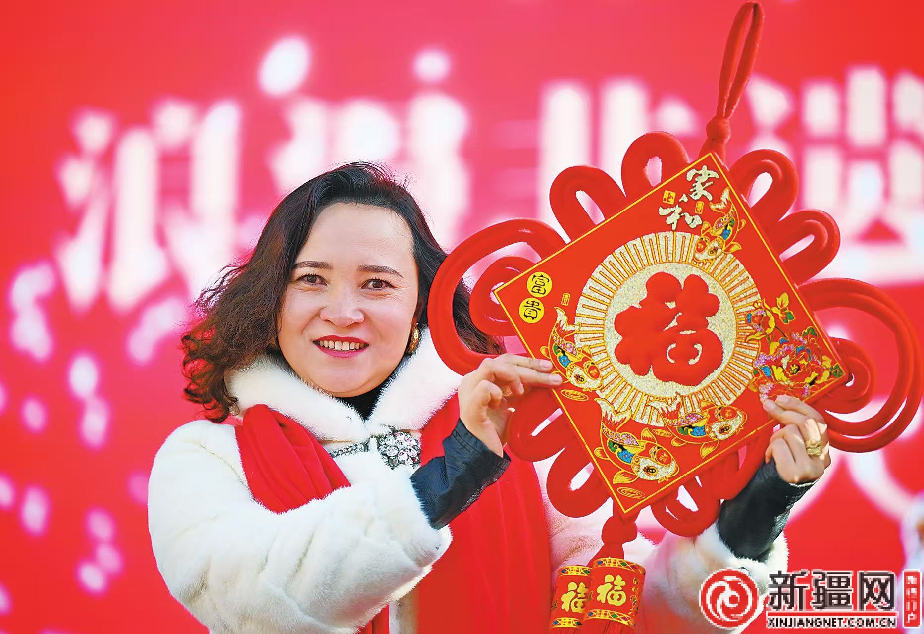 1月26日,大巴扎景區(qū),顧客展示購(gòu)買的“福”字中國(guó)結(jié)。