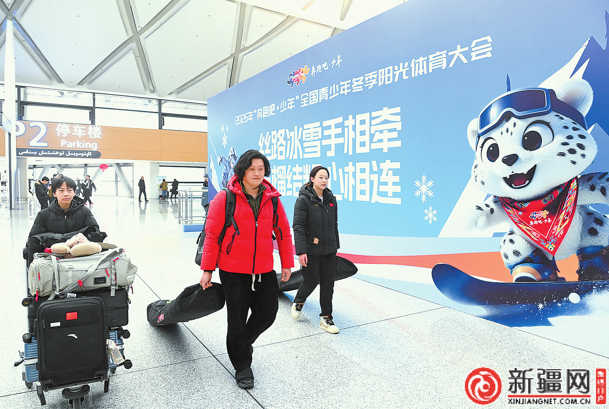 1月27日,參加2026年“奔跑吧·少年”全國(guó)青少年冬季陽(yáng)光體育大會(huì)的四川代表隊(duì)運(yùn)動(dòng)員劉峻昊(左)、王一可(右)和帶隊(duì)老師抵達(dá)烏魯木齊天山國(guó)際機(jī)場(chǎng)到達(dá)大廳。(記者陳巖攝)